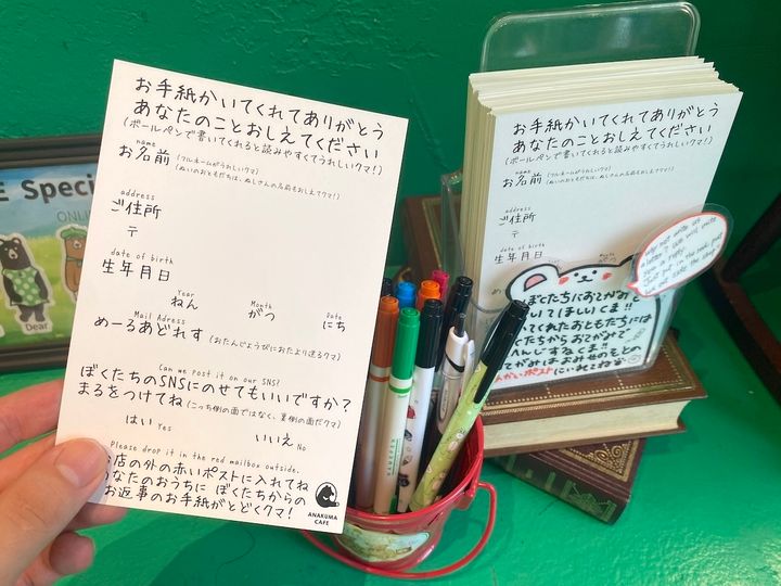 また店内ではクマ宛のお手紙を書くことができ、名前や住所などを記入のうえ専用ポストに投函すると後日自宅にクマからの返事が届きます。内容は届いてからのお楽しみ…。家に帰ってからも非日常体験を楽しめるのでぜひ手紙を出してみて。