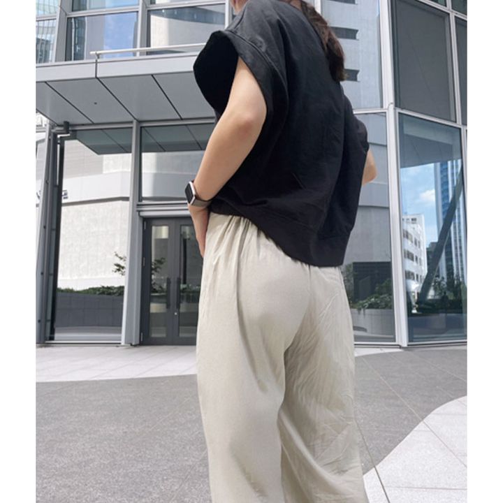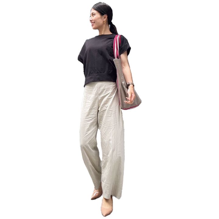今回はベージュを着用。ウエストや裾はゴムがなく切りっぱなしなので、締め付け感ナシ。縫い目も目立たないので、生地が薄手になってくる夏場も、着るものを選ばず穿けそう!