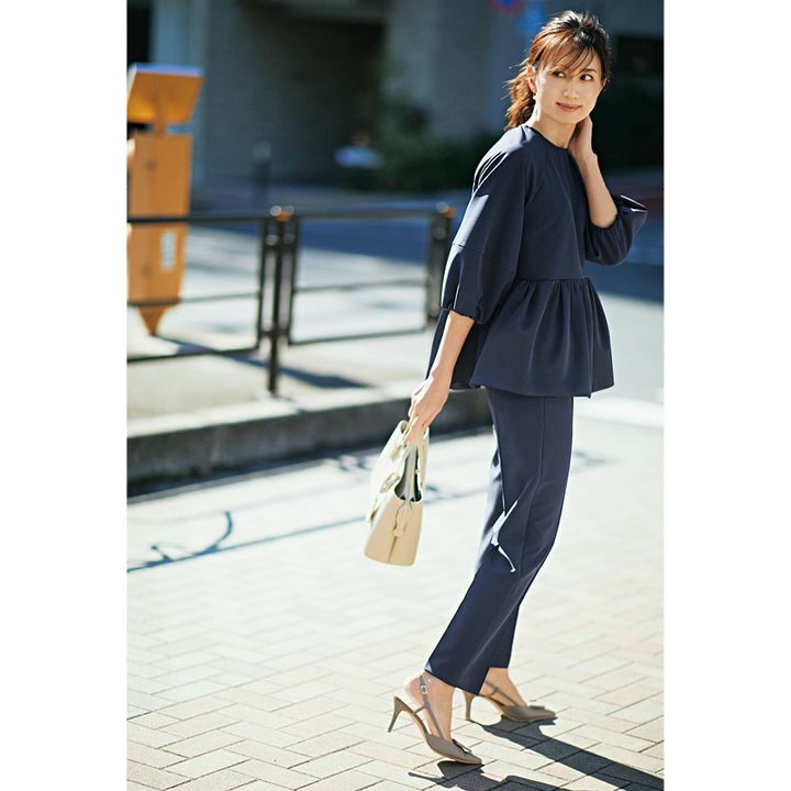 柔らかい印象のネイビーセットアップなら、かしこまりすぎず程よくキレイめをキープできます。ペプラムトップスは、ふんわりとしたシルエットが体型をカバー。キレイめパンツと着回しもしやすいので、母業だけでなくお仕事服としても活躍します!