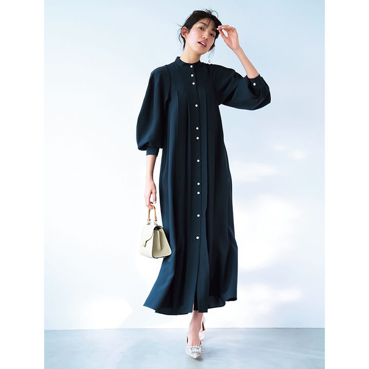 単調になりがちなワンピだけど、贅沢にタックを入れたモードなワンピなら簡単に華やか見えが叶います。立体的な七分袖もスタイルアップ効果に一役。印象的な白いボタンと、同系色の小物を合わせるとよりドラマチックな印象に。