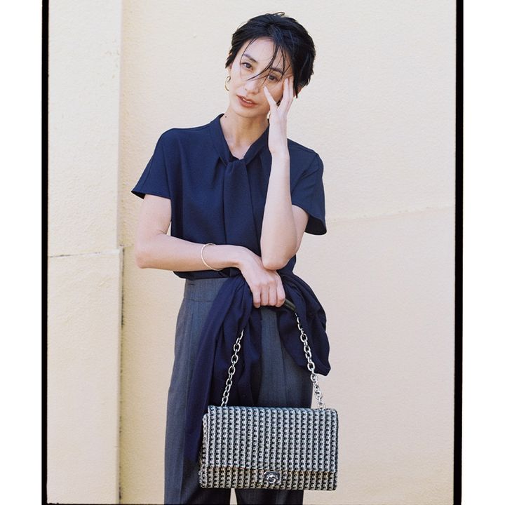 華やかさもあるネイビーのボウタイブラウスには、上品なグレーのタックパンツを合わせて大人っぽくまとめるのが正解。まだまだ暑さが残る季節には、とろみのある半袖トップスで涼やかに。カーディガンを羽織れば季節感のあるコーデを作れます。オシャレを楽しむなら、デザイン性のあるバッグを選ぶのもアリ。