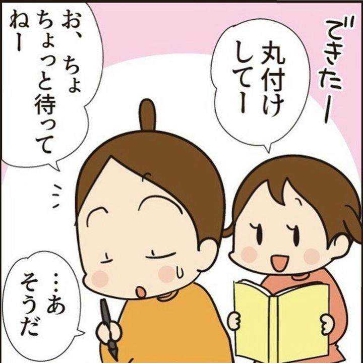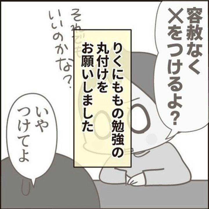 娘のももちゃんから宿題の丸つけをお願いされた、けえこ@ほわわん子育て絵日記(@howawan100)さん。手が離せない様子のけえこさんは、兄・りくくんにお願いすることにします。困惑した表情のりくくんが、妹の丸つけに対して思う気持ちと、その指導法とは…?