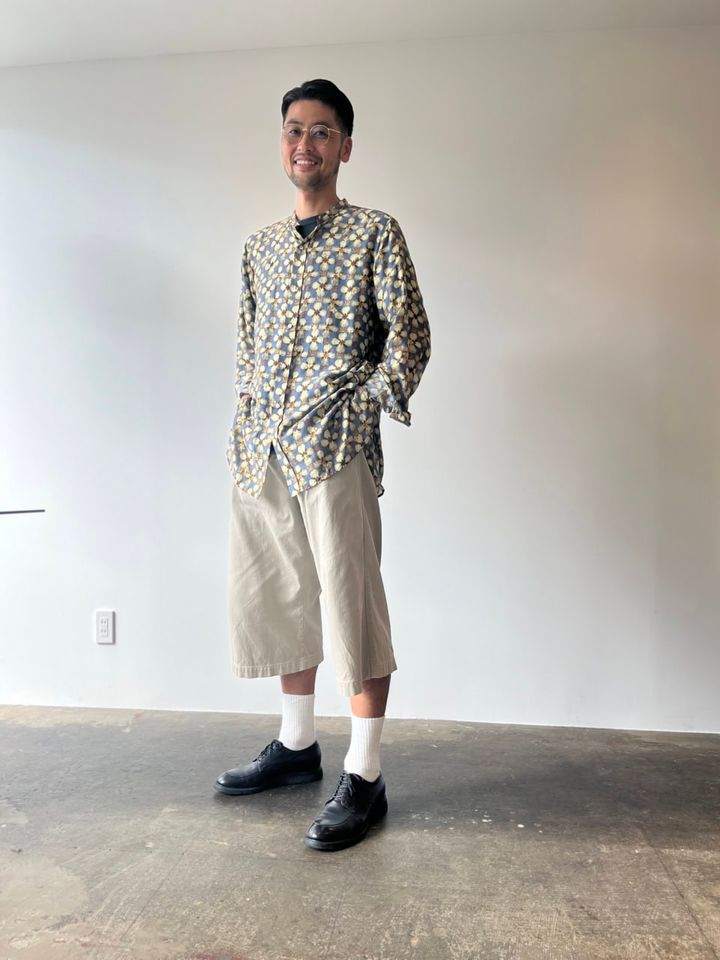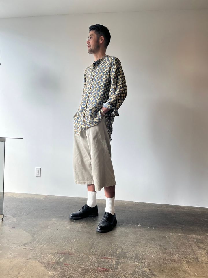 難易度の高い柄シャツを、絶妙な丈感のショートパンツでカジュアルダウンさせた着こなしを披露。「ユーゲンのバンドカラーシャツは1940年代のイギリス軍のシャツをベースにしたもの。別売りのデタッチャブルカラーでクレリックシャツにもなるのですが、今回はデタッチャブルカラーに付属する金具を第一ボタンに使用しました」