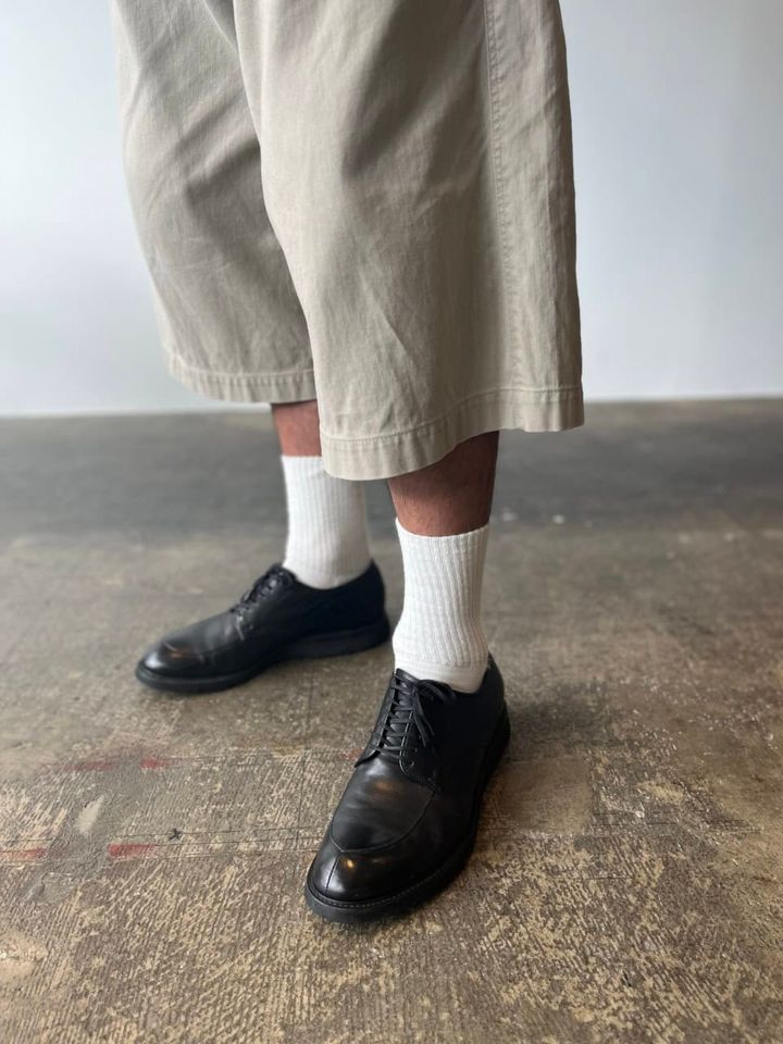 足元はレザーシューズで品よく。ショートパンツとソックスとのバランスにも注目を