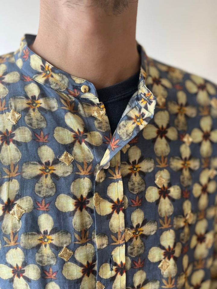 インド刺繍と第一ボタンの金具もゴールドでリンク