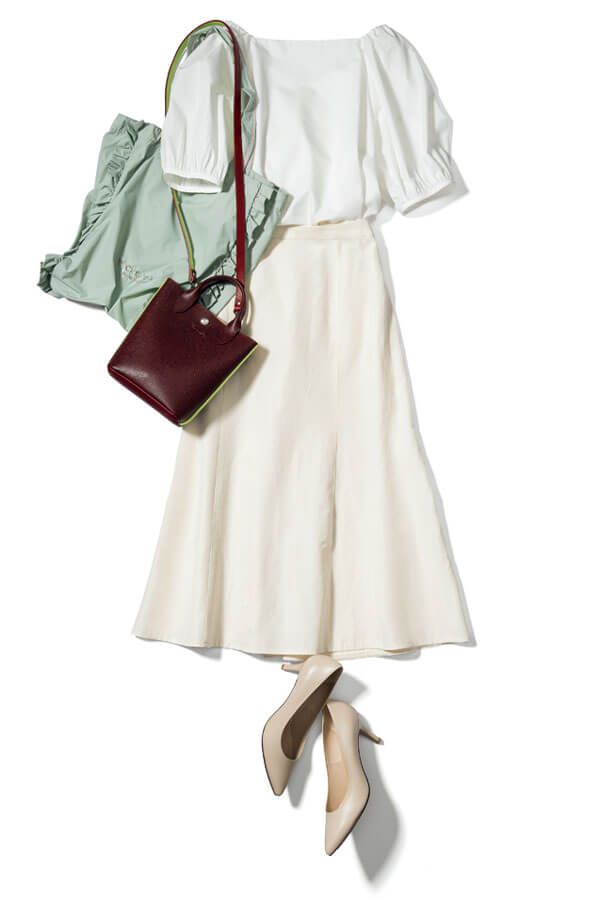 ブラウスとスカートが白でもトーンが異なるから、奥行きある着こなしに。 ライトベージュのパンプスを、オフホワイト感覚でなじませて。