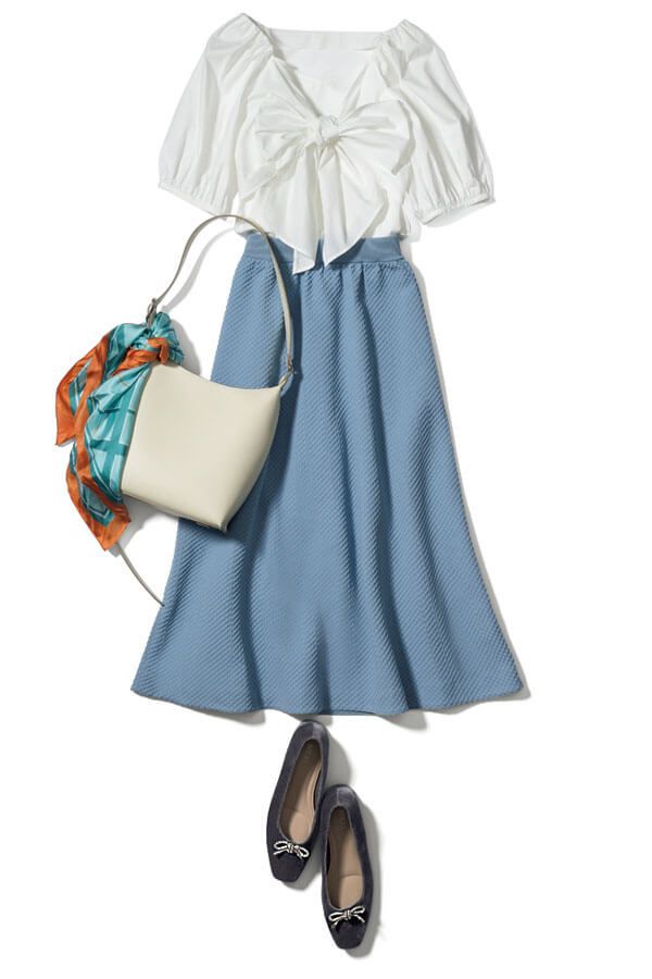 2WAYブラウスは、大きなリボンを前に着て大胆に甘さを盛っても。白1色だからうるさく見えず、×サックススカートならスッキリさわやかな印象。