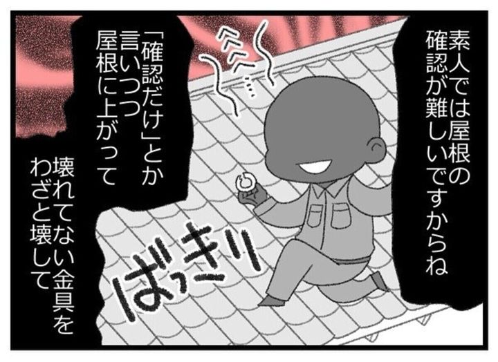 エェコさんの自宅の屋根が破損している可能性があるという男性。「点検しましょうか?」と一見親切な問いかけをしてきます。もし、皆さんの家にこのような訪問客がきたらどう思いますか?事前の知識がなければ、すんなりお願いをしてしまう人がいるかもしれません。