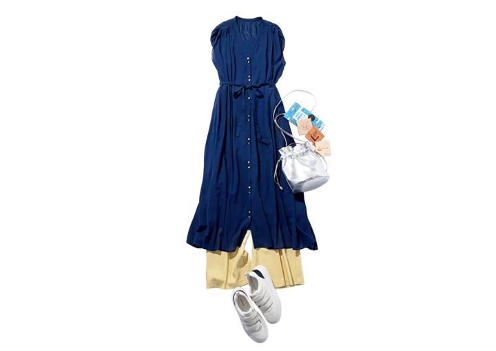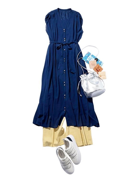 イエローセットアップ(パンツ)¥17,600/ミラ オーウェン ルミネ新宿2店 ネイビーワンピース¥22,000/マイストラーダ スニーカー¥25,300/ルーニィ シルバーバッグ¥3,628/grove(ワールド)