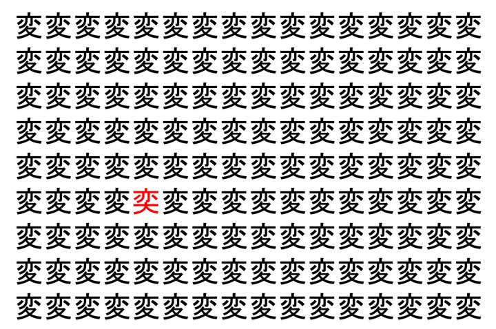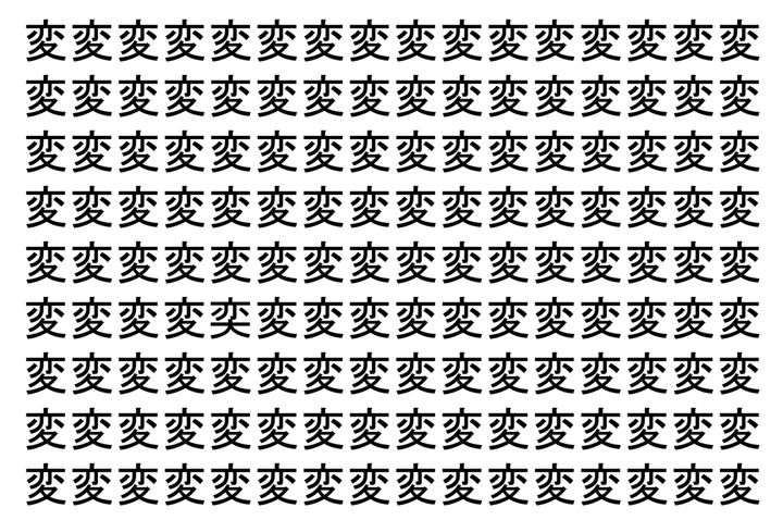 画像の中には、「変」という漢字が縦に9行、横に16個並んでいます。 全部で144個となりますが・・・、そのうち1つは「異なる漢字」となってますよ!!