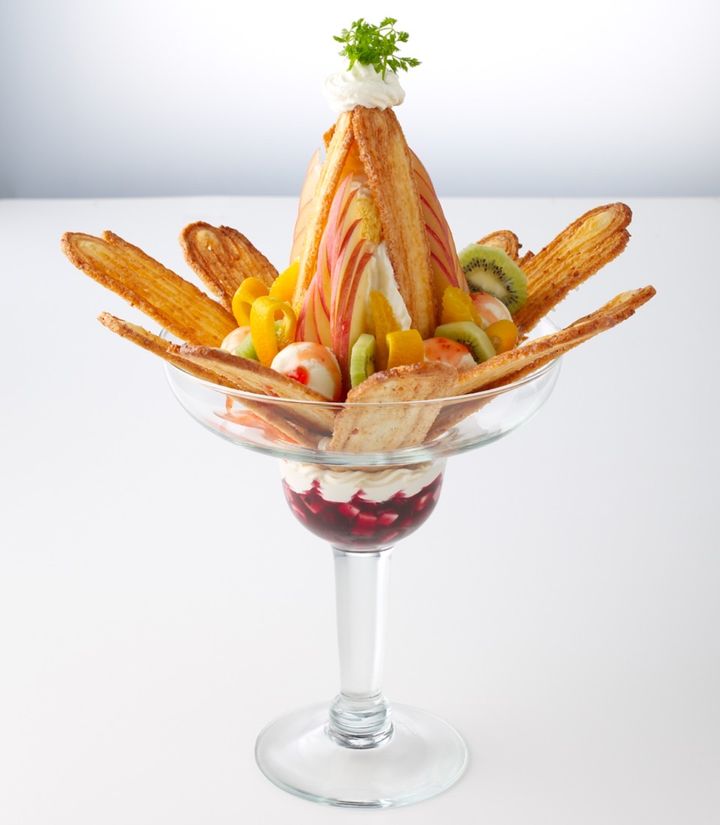 うなぎパイに合うように工夫された自家製ジェラート、みずみずしいフルーツ、そして3種のうなぎパイを計13枚盛った高さ40cm以上のジャンボサイズのパフェです。