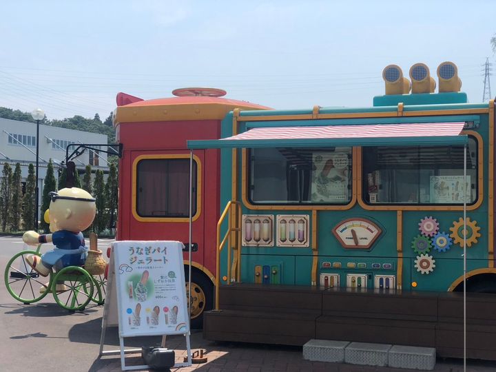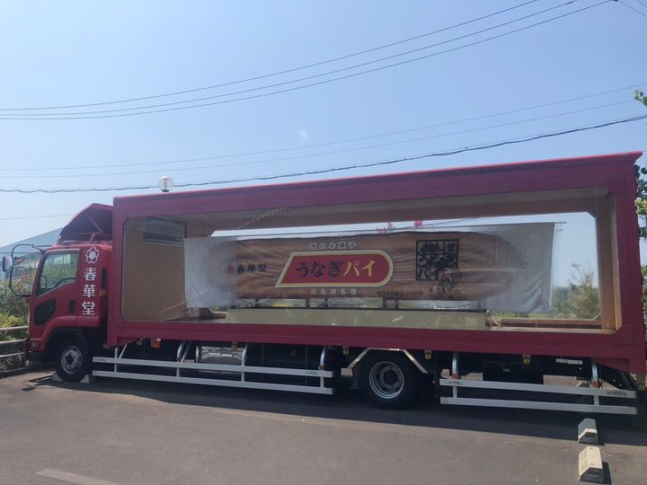 最初に目に飛び込んでくるのは、こちらの大きなうなぎパイトラック。撮影台も置いてあるため、自分たちで手軽に記念撮影を楽しめます。トラックの中のうなぎパイは、いったい通常のうなぎパイの何個分なんでしょうか…。