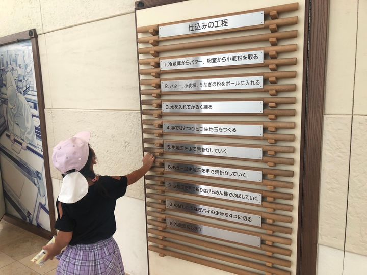 まず最初に目に入ってくるのは、原料や仕込みについての説明展示。実は、うなぎパイの生地は職人による手作りなんです。この壁の裏で生地作りを行っているのですが、その様子は非公開。その日の気温や湿度によって、調整しながら作っています。