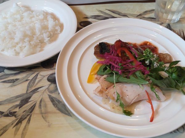 続いてメイン。この日はスズキのソテートマトとバジルのソース、もうひとつがチキンの燻製仕立て。なんとメインが「魚とお肉のコンビネーション」なんです!これは一皿で二度おいしい! 野菜もバランス良く真ん中に。生のバジルも添えて。