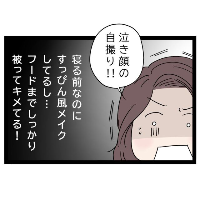「な、泣き顔の自撮り!!」レイ子さんの写真を見ながら「寝る前なのにすっぴん風メイクしてるし・・フードまでしっかり被ってキメてる!」雅美さんはさらにドン引きしました。