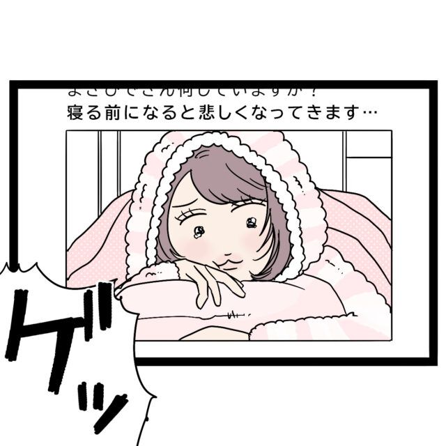 さらに2人のやりとりをさかのぼっていくと、フードを被りベッドに入って涙ぐむレイ子さんの写真が!そこには「寝る前になると悲しくなってきます・・」と文章が添えられていて、「ゲッ!」雅美さんは思わず叫びました。