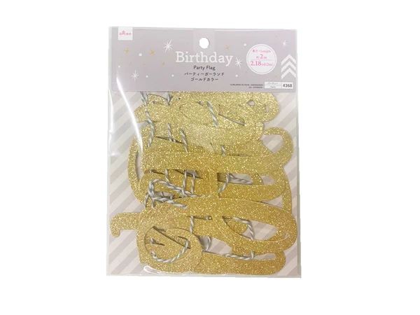 ラメ入りでキラキラと輝く“HAPPY BIRTHDAY”の英文字がオシャレな、ゴールドの「パーティーガーランド」。約2mと見ごたえのある長さで、壁に飾ると一気に部屋がパーティーらしくなります。