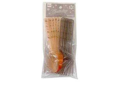 誕生日パーティーの食卓にぴったりな、王冠と星柄入りのスプーンとフォークのセットです。ポリスチレン製ですが、ブラウン系のカラーにゴールドの柄という高級感のあるデザイン。おしゃれなカトラリーは、大人のパーティーにもおすすめです。