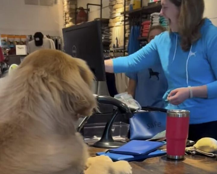 おやつをもう1個欲しい犬さん、レジに並んでおねだり♪