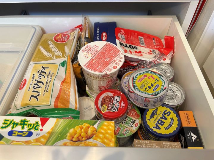 我が家のストック食材の一部。コーンやシーチキンの缶詰は子どもが大好きなので欠かせません!