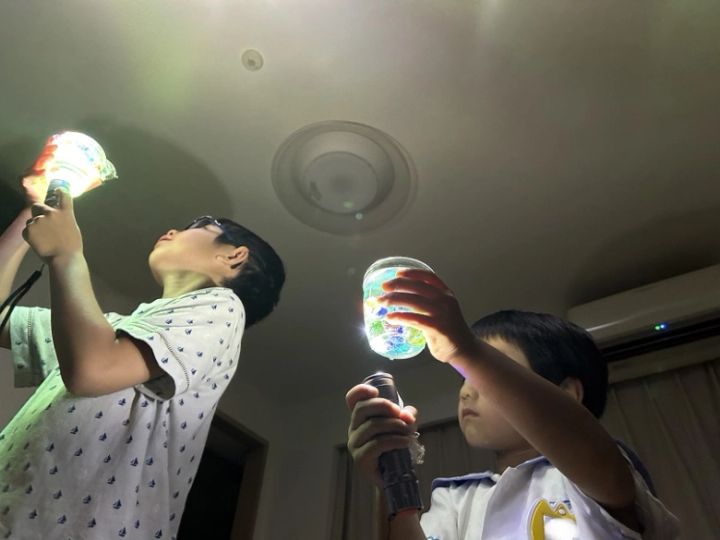 用意するものは、カラフルなビー玉・透明なコップ・水・懐中電灯。コップにビー玉と水を入れ、部屋の電気を消します。そしてコップの底や側面から懐中電灯の光を当てます。そうすると…部屋に幻想的な光の空間が現れます。「きれい!」「こっちから当てると光が変わる!」と2人で仲良く遊んでいました。災害で停電になって照明が使えないときに、懐中電灯でこんなこともできると遊びで感じてもらうのも良いですよね!是非夜の自宅で試してみて下さい。