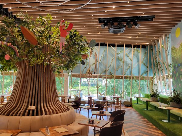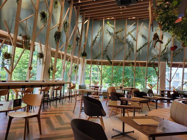 センターには段ボールで作られた大きな木が鎮座。さまざまな席があって一人でも入りやすく、過ごしやすい空間です。