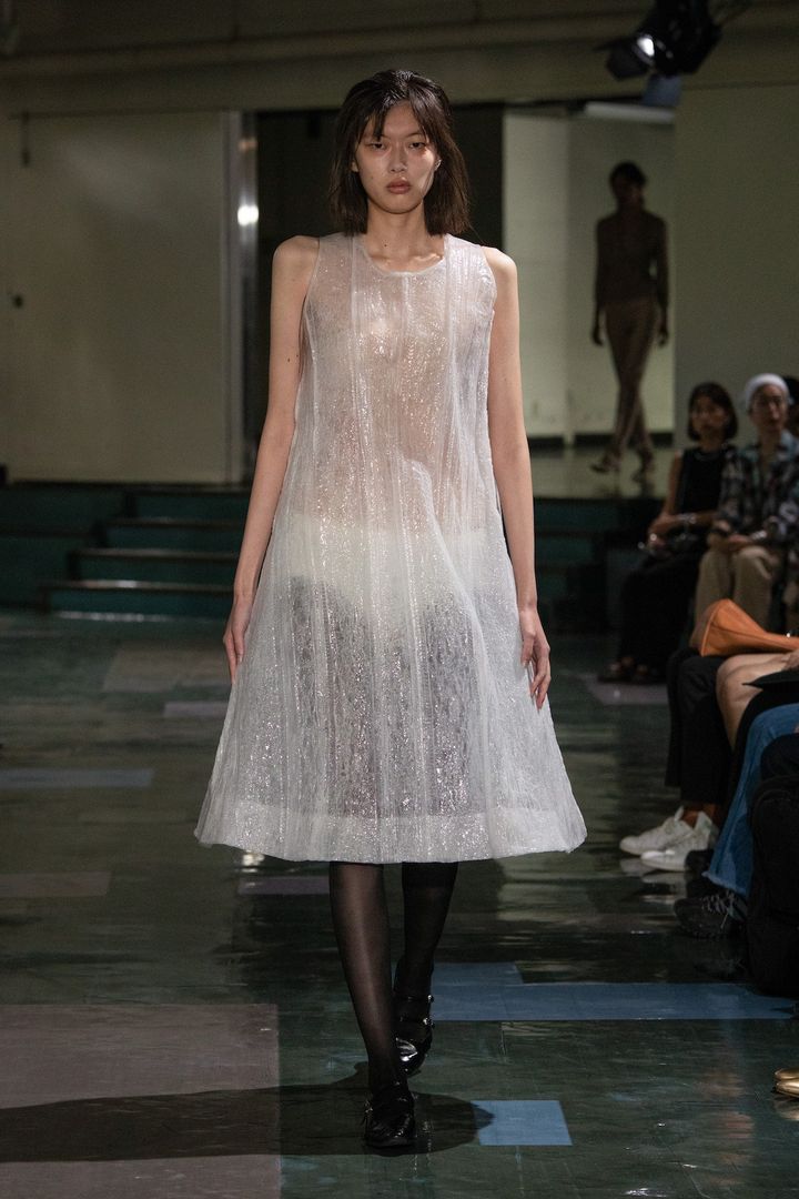 9月5日(木)、東京・科学技術館でピリングス(PILLINGS)が、楽天ファッション・ウィーク東京で2025年春夏コレクションを発表した。今シーズンは小説家、古井由吉による「杳子」がインスピレーション源。同作品は神経を病む女子大生の杳子と、そんな彼女を見守る彼の孤独でいびつな愛の物語だ。デザイナーの村上亮太は「杳子」のアンニュイな世界感に共鳴し、自身のアトリエのレースカーテン越しから見える、毎日変わり映えのない風景を“外と内の揺らぎ”として衣服に落とし込んだ。