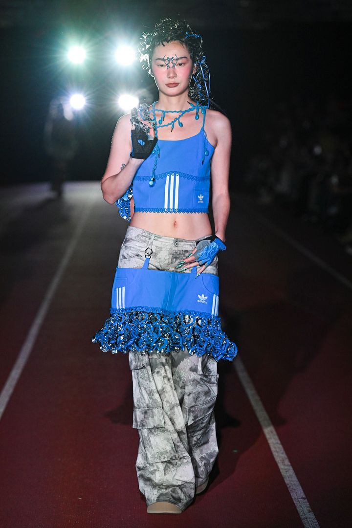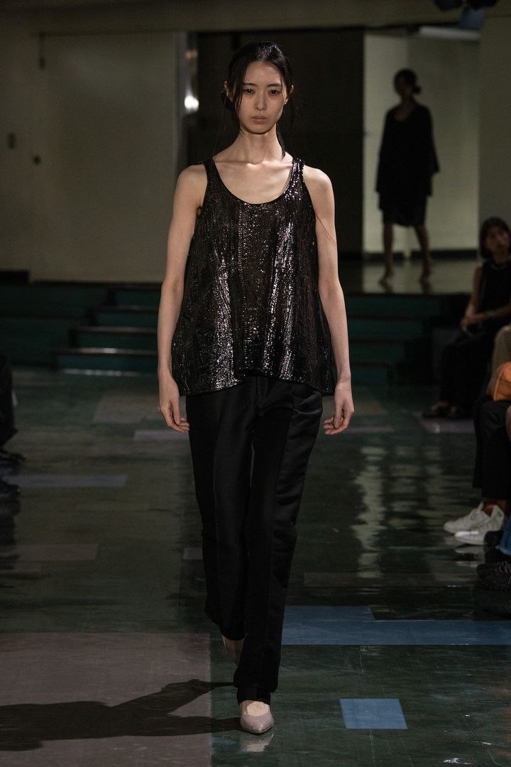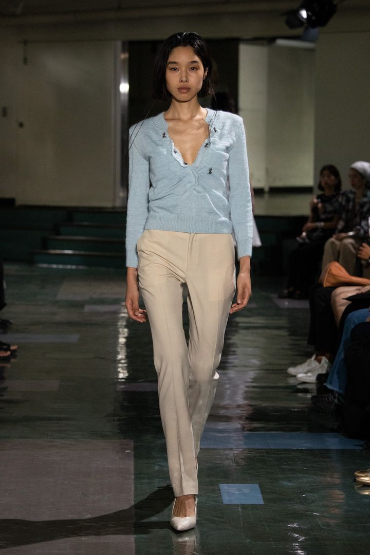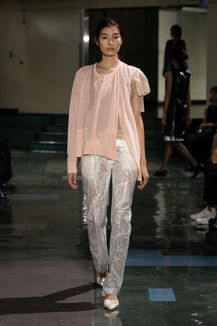ボトムは縫製の構造が見えるよう、透ける素材を使用しポケットをやや深めに設定。あえてシワを寄せることでスタイリングに軽やかなリズムを表現した。デザイナーの村上は「日常で着るよ うなアイテムをデコラティブなもので表現するのではなく、カーテンのような素材に微妙なシワ やタックを入れて女性の身体と布に自然な空間のようなものをつくりたかった」とコメント。