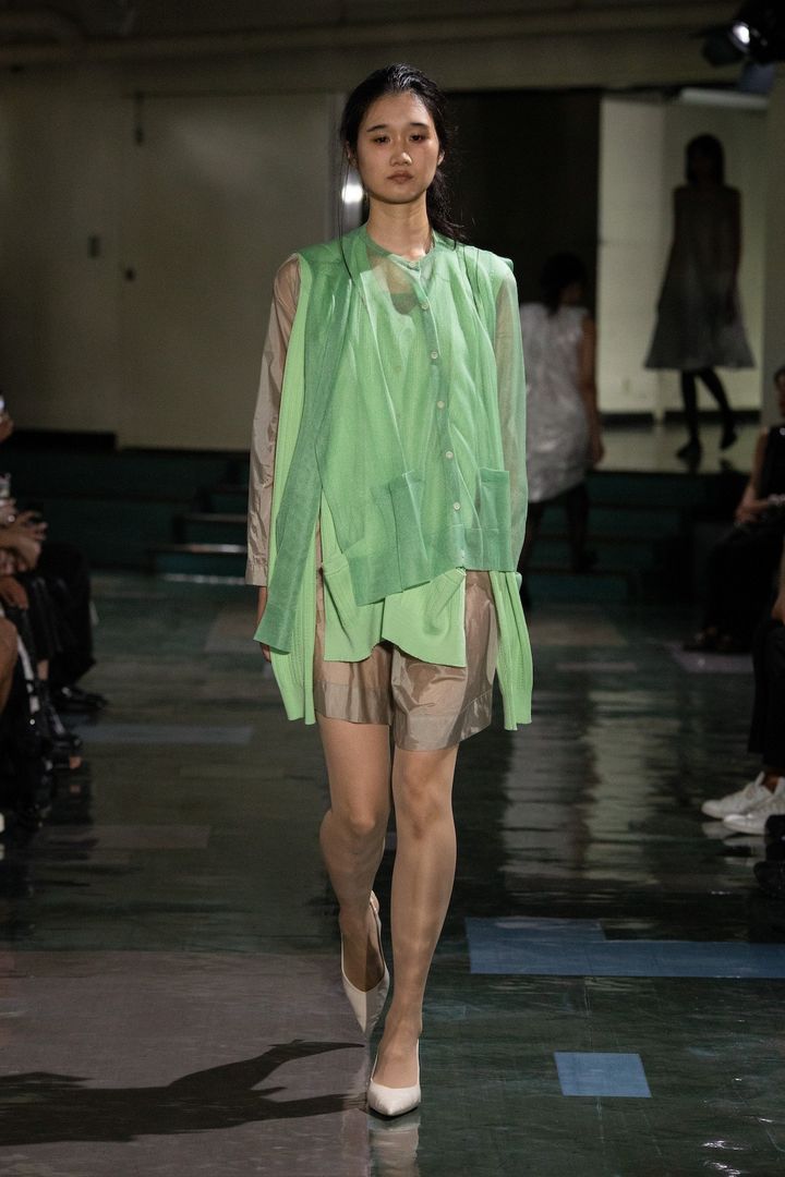 カラーパレットは、ニュートラルなベージュや淡いピンクを中心に、シャープなブラックが差し込まれた。古い学校や公共施設のようなショー会場の雰囲気はレトロなグリーンのニットともリンクする。いずれもアシンメトリーにレイヤリングし、袖と襟をずらすようなスタイリングで身体を オブラートのように包み込み、シルエットに緩急を生み出している。