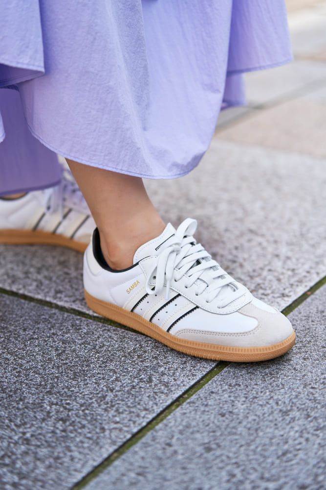 3. 「アディダスのサンバ」の白はカラースカートとの相性◎【大人のスニーカーコーデ】
