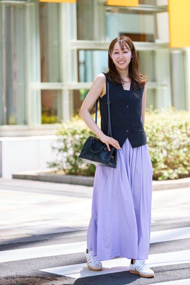 サンバはシンプルだけど存在感があって、スカートやワンピースなど普段のコーディネートに取り入れやすいところが好きです。特に3本ラインがオフホワイトのタイプは主張しすぎないので、きれいめなお洋服にもしっくりきます。お気に入りのライラックカラーのスカートとも相性バッチリ。一見シンプルな黒のベストは、後ろがリボンになっているという甘辛バランスが今の自分にちょうどよく、黒でも涼しげに見えるのでこの夏重宝しました。