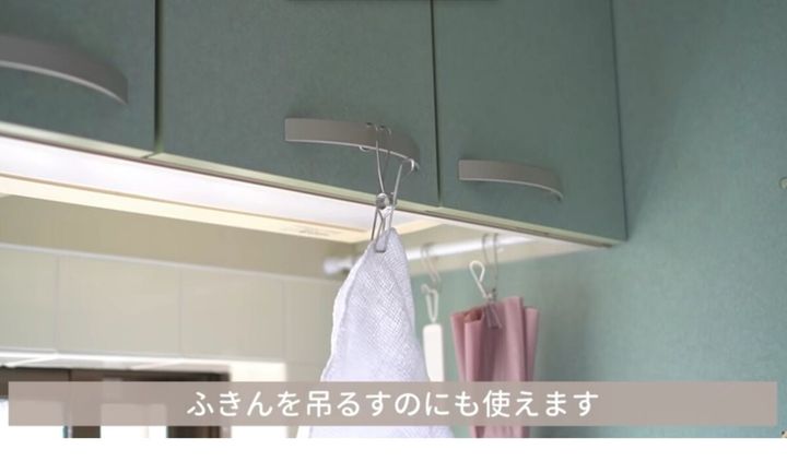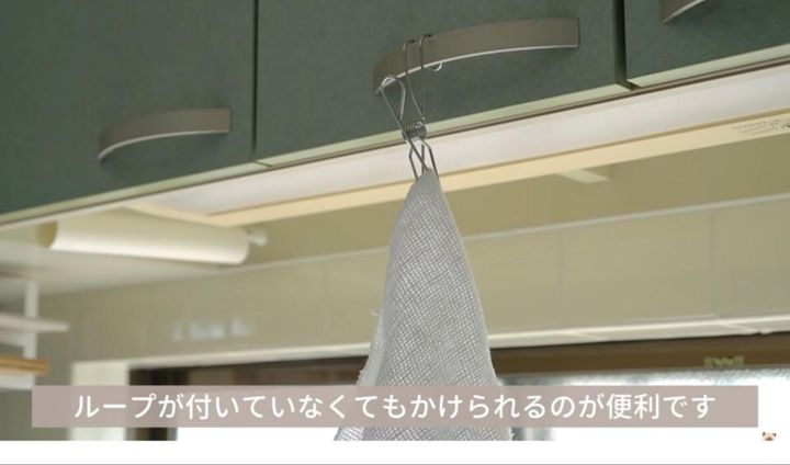 また、シンク上やシンク下収納の取っ手を使えば、ふきんも干せます。ループがついていないふきんでも、かんたんに付けられるから重宝すること間違いなしです。