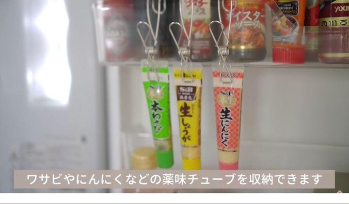 冷蔵庫内のデッドスペースに、わさびやにんにくのチューブをぶら下げて収納。見やすくて取りやすいのもポイントです。