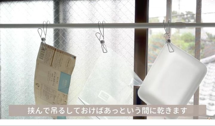 窓ぎわにつっぱり棒をつけて、はさんでつるすだけ。ジッパーパックやトレイなど自立しないものもストレスなく乾かせるのがうれしいですね!