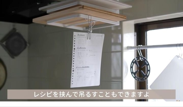 収納だけでなく、レシピを書いたメモ帳や買い物リストなどをつるすことで、目線の高さで見やすくなります。メモ帳をキッチンに置いているとぬれたり汚れる心配がありますが、つるしていれば安心です。