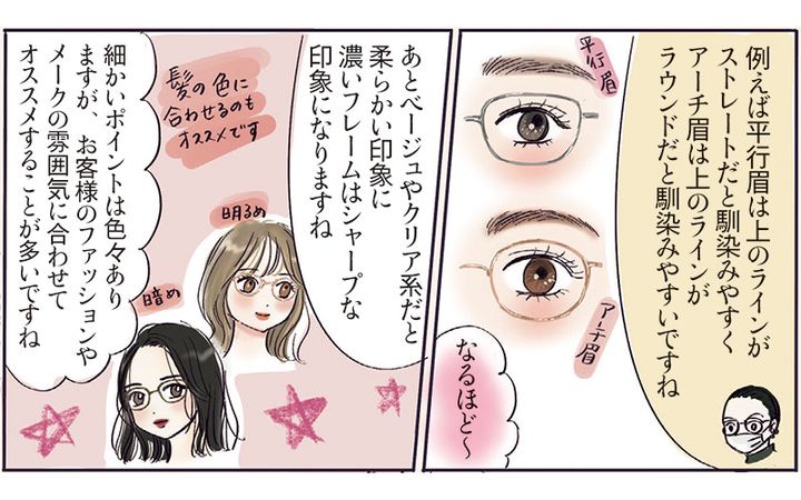 眉のアーチや顔の輪郭を意識しながら、近い形状のメガネを選ぶとよりしっくり馴染むそう。自分に似合うフレーム色×形の組合せで、候補のメガネを絞っていきます。