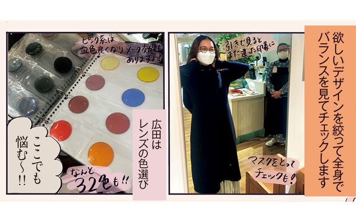アドバイスをもらいながら、洋服やヘアメーク、メガネを含めたトータルバランスを考えて最終セレクト。自分に似合うのはもちろん、全体にまとまりが出るので洒落た雰囲気に。