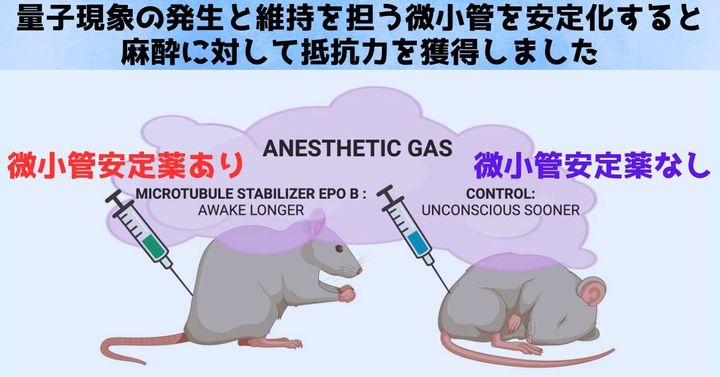 もし微小管が意識の発生や維持に重要な役割をしているならば、微小管安定化薬を加えることで、麻酔の効果に抵抗できるはずです。