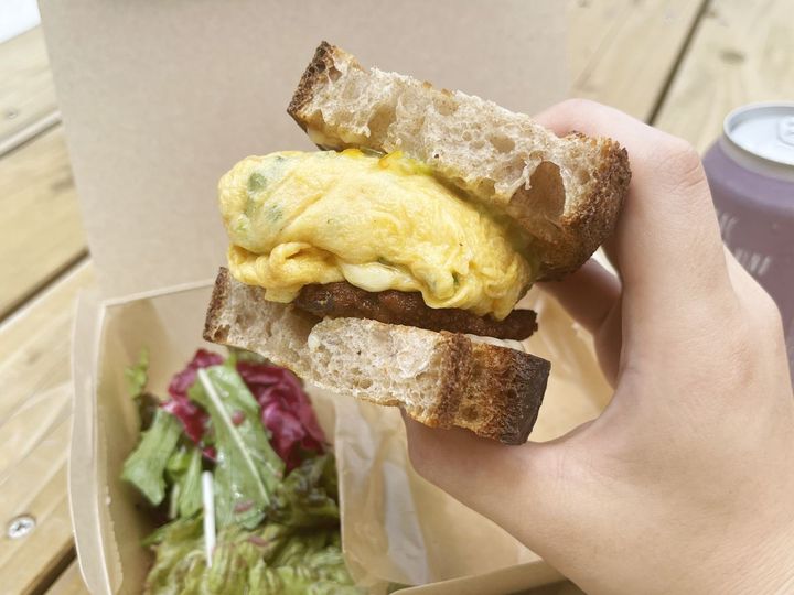外側はカリッカリ、中はふんわり食感のカントリーブレッドに、分厚いオムレツをはさんだ「Parklet Kiosk」の「オムレツサンド」1200円は、小さめサイズに見えて実はボリューム抜群なサンドイッチ。お供には、すっきりとした味わいとベリーの風味が特徴的なロゼスパークリングワイン「ブロックセラーズカリフォルニア」2400円を。