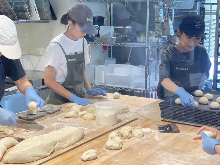 「Parklet」の商品はすべて、お店のキッチンで一から作られています。ショーケース横にある工房からパン作りの様子をのぞくこともできるので、ぜひ見学してみてくださいね!