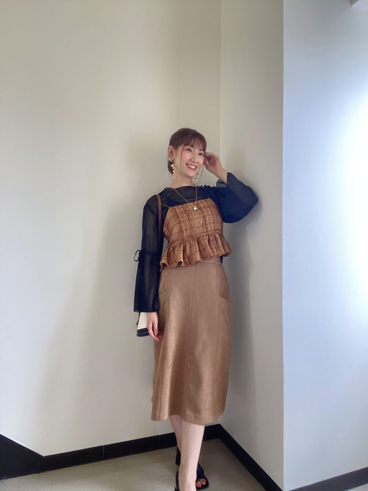 最後は秋口におすすめのビスチェ合わせのコーデ。 キャミビスチェやボトムはブラウン系にして、ブラック ✕ ブラウンで秋を感じさせる色合いにしました。