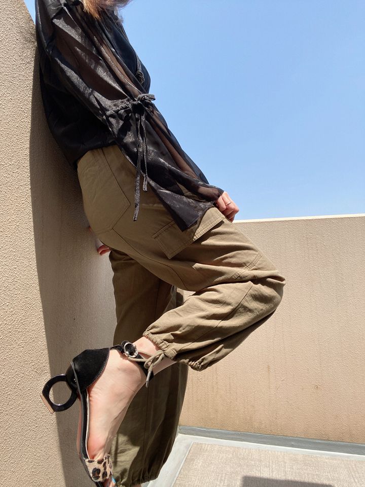 ゆるっとしたカーゴパンツと合わせれば大人のシンプルコーデの完成! 黒とカーキの配色が晩夏にぴったりです。 黒ですがシアー感があるので、暑苦しく見えません。