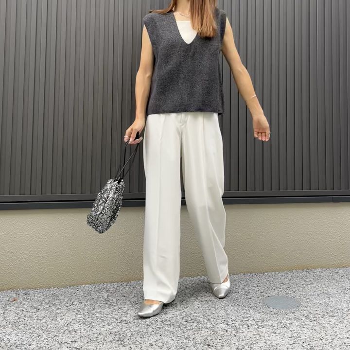 ユニクロの「タックワイドパンツ」を合わせました。 グレー ✕ ホワイトは相性抜群! シルバーのパンプスが映えますね♪