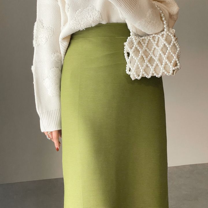 ストンと落ち感のあるタイトスカート。 ラインが綺麗で丈も長めなので、スタイルアップ間違いなし! オリーブカラーが秋らしく、1点投入するだけで秋らしい装いが完成します。