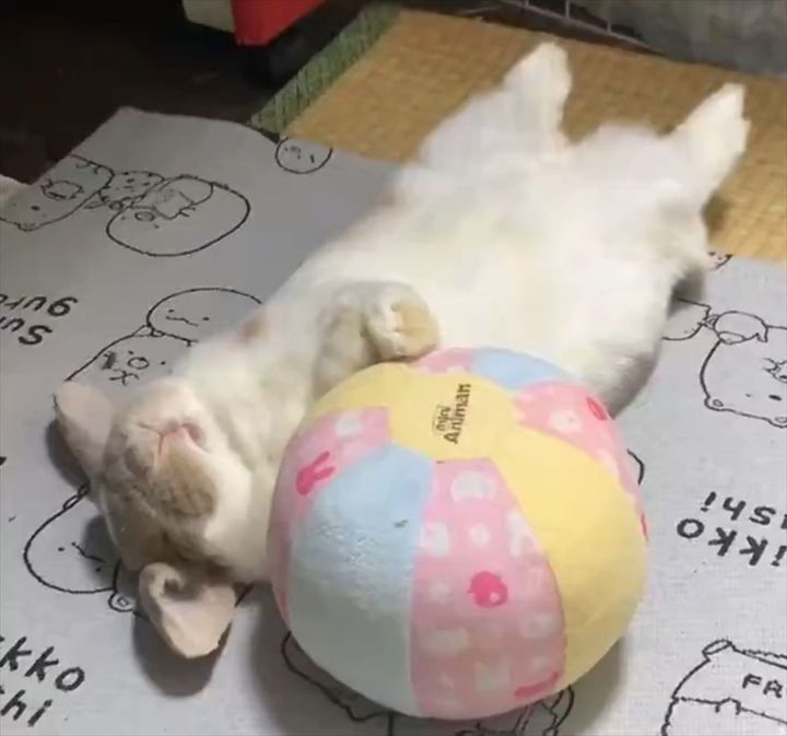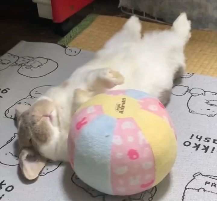 その時、ココくんは仰向けになって目を閉じていました。 体を伸ばして、すっかりリラックスしているところだったようです。
