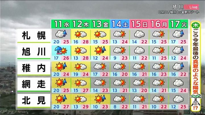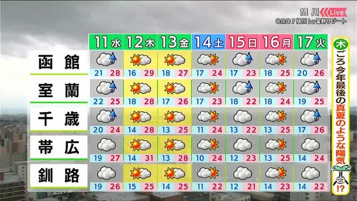 木曜金曜と晴れて、木曜は帯広で31度の真夏日予想です。週末は涼しくなるため、木曜日頃が今年最後の真夏のような陽気になるかもしれません。