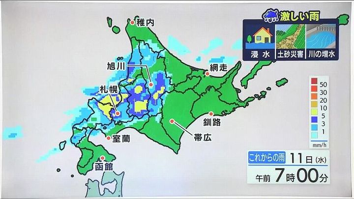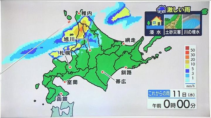 その後は雨雲が南下し、札幌でも午前5時頃から雨が降ります。道北を中心に激しい雨による低い土地の浸水や土砂災害、川の増水に注意してください。## 11日(水)の天気と気温