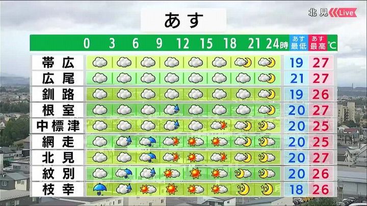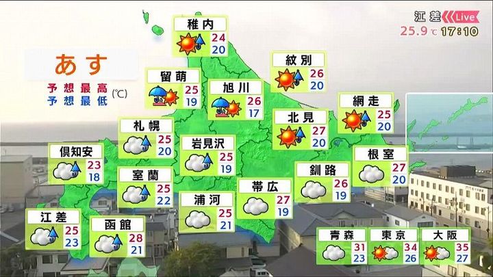 太平洋側は曇り空でしょう。オホーツク海側は朝まで雨で日中は晴れるので、晴れ雨兼用の傘があると良さそうです。あすも真夏並みの暑さが続きます。