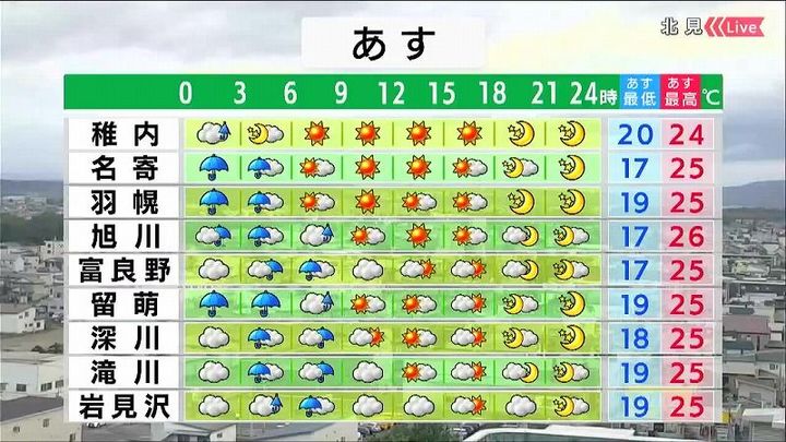 旭川や岩見沢など朝まで広く雨が残ります。雷雨などに注意してください。午後は各地でカラッと晴れるでしょう。海岸部では風のやや強い状態が続きます。