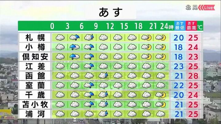 雲に覆われ、通勤通学の時間帯は札幌や苫小牧など雨が降るでしょう。10日夜は20度を下回らないところが多いですが、日中は25度前後で厳しい暑さはなさそうです。